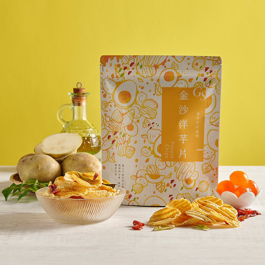 GS曼貫砲獨家研發金沙醬+精選新鮮洋芋(馬鈴薯)組成的唰嘴美味零嘴,洋芋片以烘烤方式製成,更清爽純粹,抹上金沙醬就成了大人小孩都愛吃的經典美味!