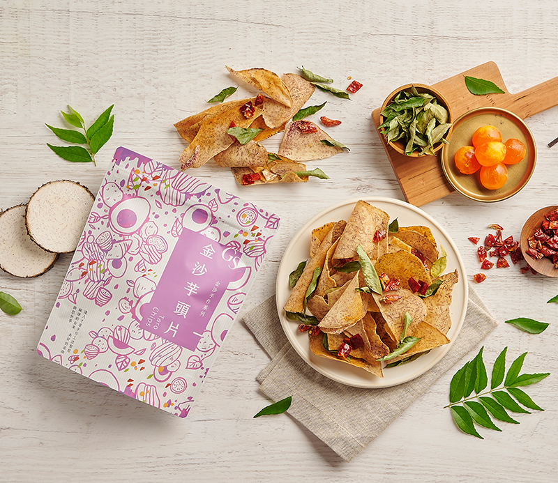 新鮮台灣產特級芋頭,芋香十足,口感細緻,抹上GS金沙醬烘烤後的芋頭片不僅芋香四溢,金沙濃郁滋味更讓芋頭片多了豐富口感,。